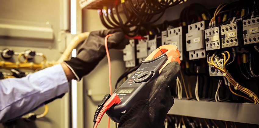 Expert electrician works in switchboard with